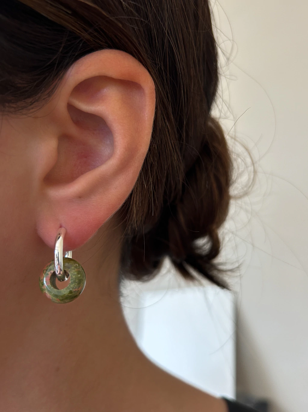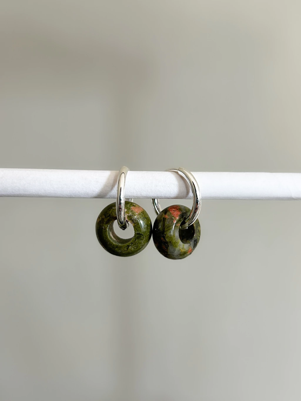 Descripción: Aros de 1,5cm de diámetro con piedra narural unaquita. Las piedras son naturales, no hay dos iguales por lo que el color puede variar.